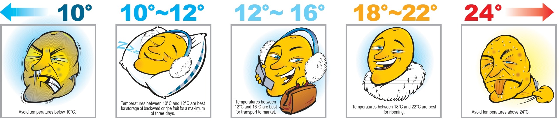 Nhiệt độ trên 24°C trong quá trình chín làm tăng khả năng thối rữa, vết nứt trên da và màu vỏ xanh khi chín.