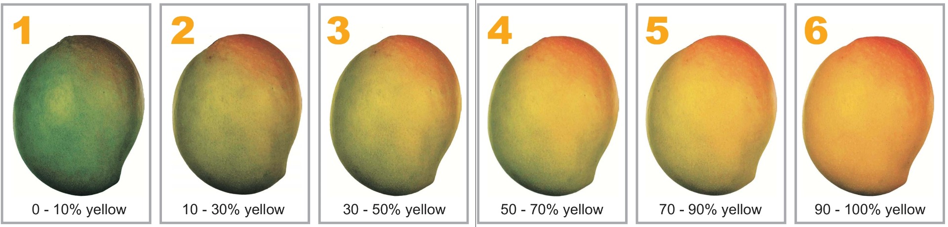 Trái xoài có sáu giai đoạn từ xanh đến chín tuyệt đối. Nếu xoài chín xanh, có nghĩa là trái có thể tiếp tục chín sau khi được hái. Ngược lại, nếu xoài chưa chín hoàn toàn, chúng ta gọi là xanh hoặc trái non.