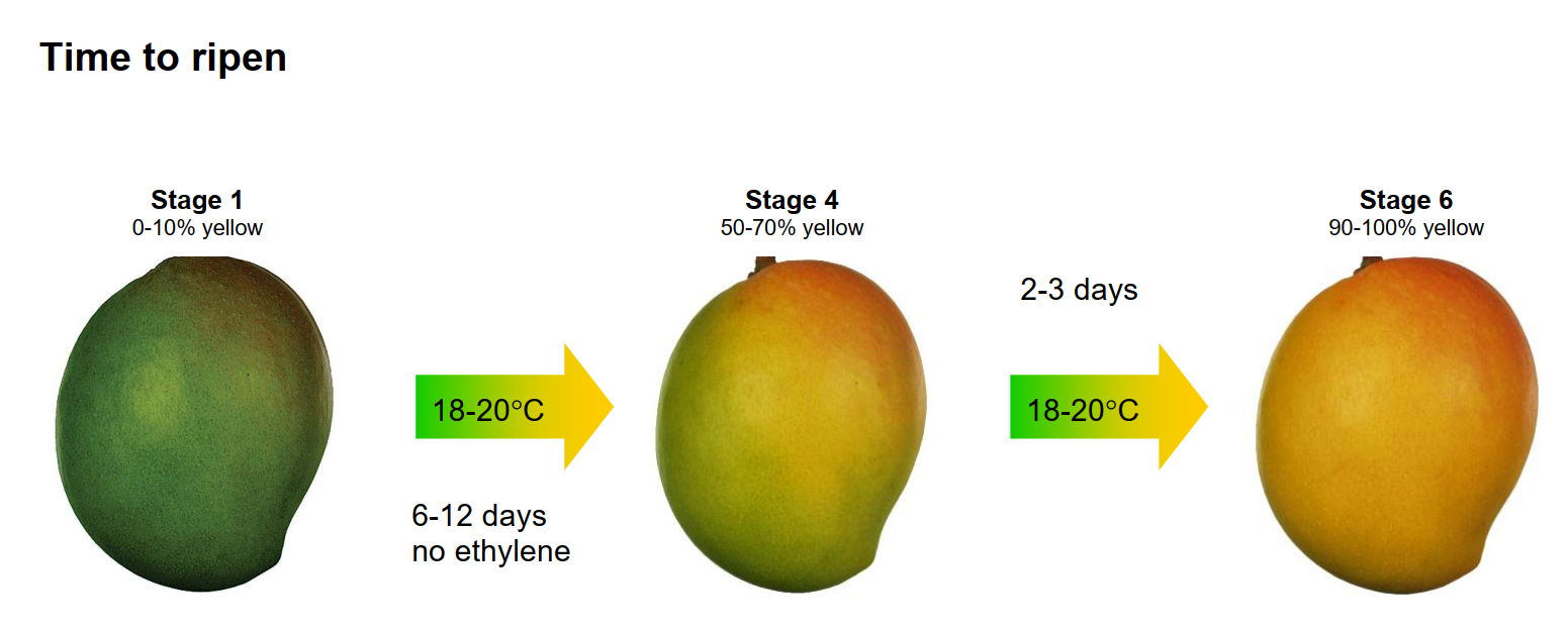 Sau giai đoạn 6, xoài chín có thể bảo quản ở nhiệt độ mát 18-20*C trong vài ngày.