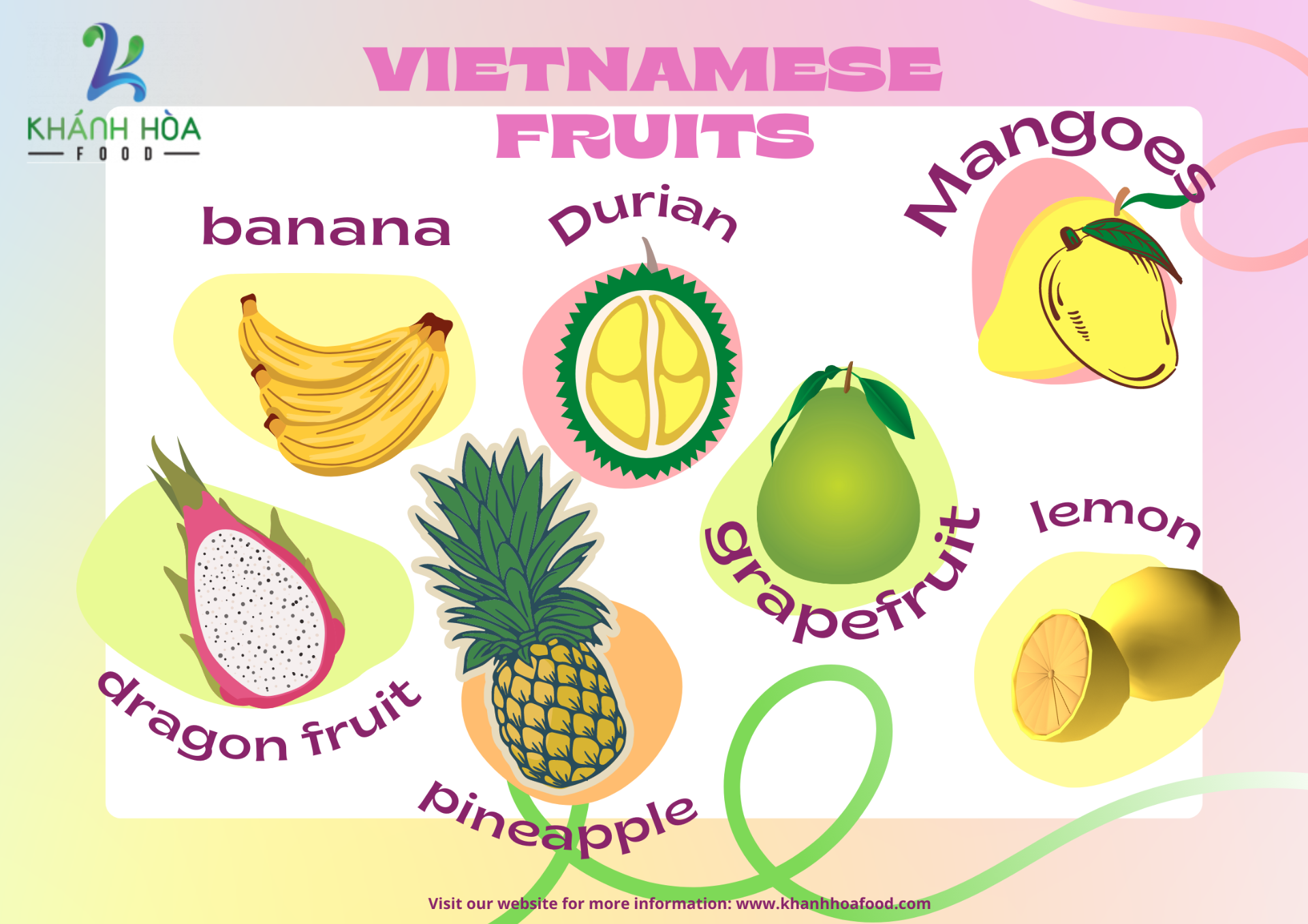 KHÁNH HÒA FOOD nằm trong vùng trái cây nhiệt đới lớn nhất Việt Nam. Ở khu vực này, có các loại trái cây được trồng và thu hoạch để sản xuất quanh năm. Công ty có nhiều loại trái cây đông lạnh và tươi IQF như Xoài R2E2, Thanh long, Dưa hấu, Chôm chôm, Ổi, Dứa, Chanh dây, Mãng cầu xiêm, Đu đủ, Chuối, Mít, Nha đam, Sầu riêng và Chanh.